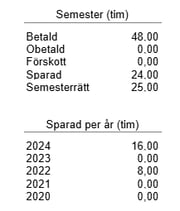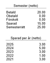 Semesterberäkning: Systemet använder det sparade värdet som beräknades vid det senaste semesterskiftet. Detta värde visas sedan i anställningsregistret.