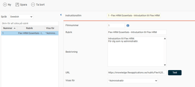 Språk: Välj vilket språk filmen har. Om du väljer Alla visas filmen oavsett vilket språk användaren har inställt i Flex HRM.