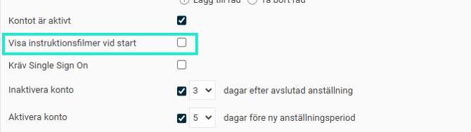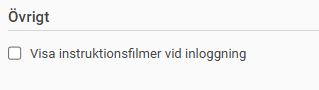 Du kan ställa in att instruktionsfilmerna ska visas automatiskt vid start för en användare. Det innebär att rutan med de filmer du har lagt upp visas direkt när användaren loggar in.