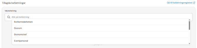 - Lägg till alla aktuella befattningar som passar i jobbprofilen. Klicka i rutan för att söka fram befattningar ur ert befattningsregister.