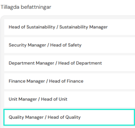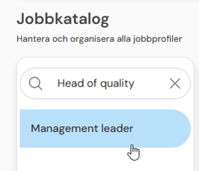 Exempel: Om du söker på befattningen "Head of Quality" visas jobbprofilen Management leader, då den jobbprofilen innehåller befattningen du sökt på.