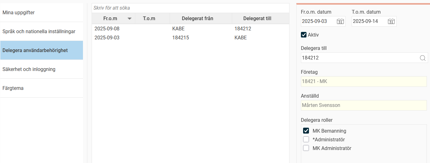 I vyn kan du se både de delegeringar du själv har gjort och de som har tilldelats dig.