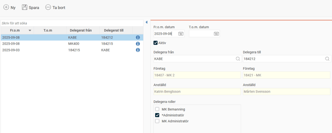 I listan till vänster ser du aktuella delegeringar. Vill du se historiska delegeringar går det att välja. Du ser datum för delegeringen samt vilken användare som delegerat till vilken användare. Om du håller muspekaren över infosymbolen får du också information om vem som senast sparade delegeringen och när det gjordes.