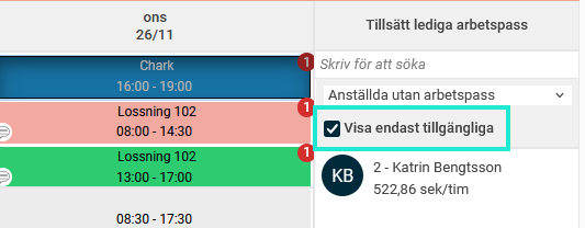 När du ska tillsätta ett ledigt arbetspass i vyerna Bemanningsplan, Arbetspass och Schema kan du välja att endast visa anställda som angett sig som tillgängliga.