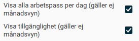 | I Schemavyn kan du också välja att under Mer > Inställningar bocka i Visa tillgänglighet (gäller ej månadsvyn). Observera att eftersom anställda kan ange tillgänglighet på delar av en dag så krävs det att inställningen ovanför (Visa alla arbetspass per dag) är markerad för att du ska kunna visa tillgänglighet. |
