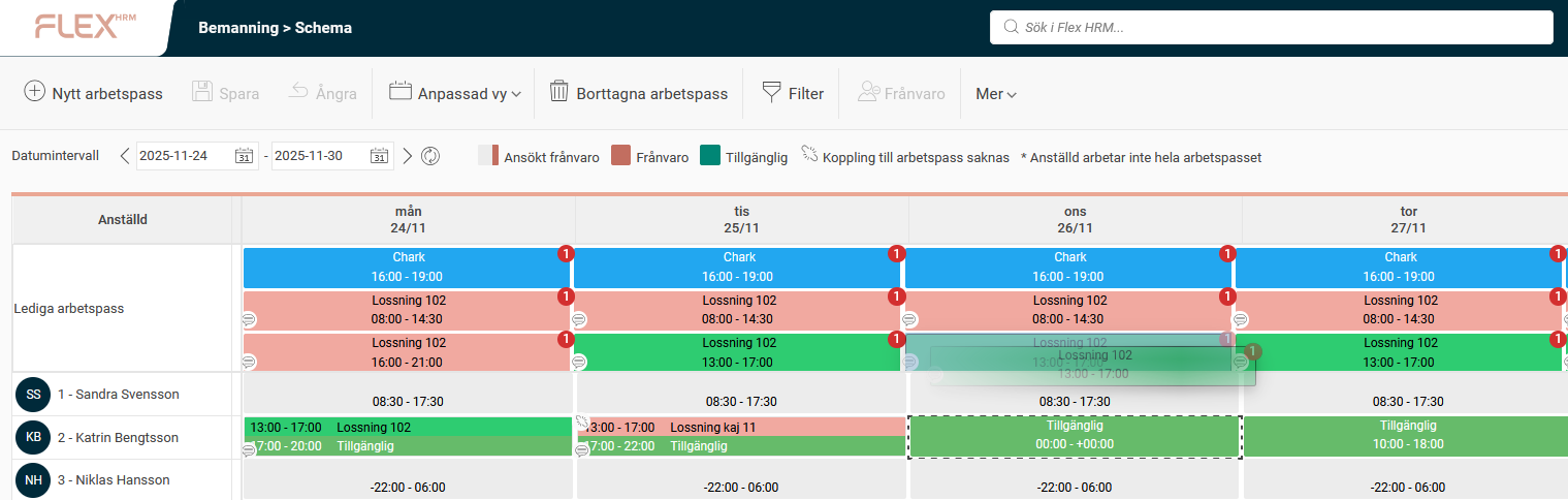 När vi drar ett pass för 26 november kl 13:00-17:00 markeras anställd 2 med streckad linje, eftersom hon är tillgänglig och inte bemannad på något annat arbetspass.