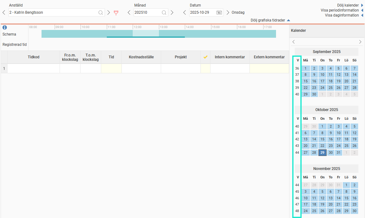 När du har gjort inställningen kommer kalendern i tidrapporten att visa veckonummer.