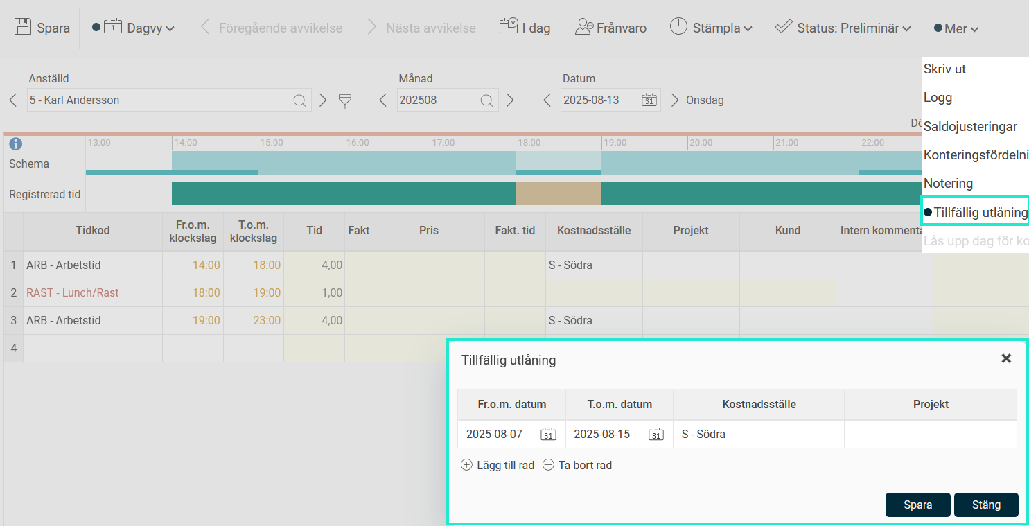 Du hittar Tillfällig utlåning under Mer-menyn i tidrapporten. Ange datumintervall och önskade konteringar. Dessa konteringar kommer att läggas ut i tidrapporten, om ingen annan kontering angetts.