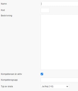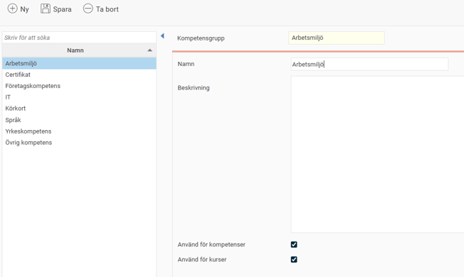 - Beskrivning finns till som en hjälptext när du lägger upp en kompetens på en anställd. Väljer du graderingar kan du med fördel skriva in en beskrivning för att tydliggöra vad varje nivå innebär.