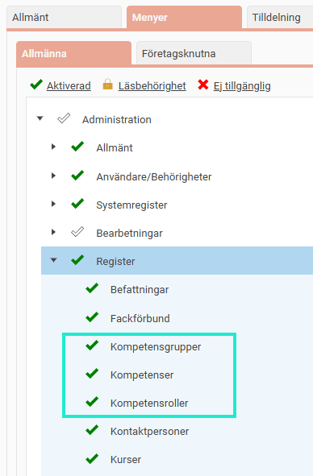 För att kunna administrera register av kompetenser, kompetensgrupper samt kompetensroller behöver följande aktiveras för administratören.