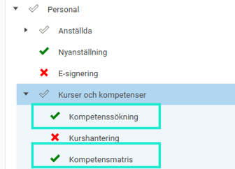 För en roll som ska få tillgång till kompetenssökning och kompetensmatris aktiveras följande på rollen under Personal