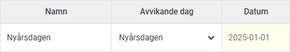 Kontrollera avvikelsedagarna för det nya året genom att gå in under Administration – Inställningar – Tid och Bemanning – Scheman – Avvikelsedagar. Har du använt någon av de fasta dagarna under kolumnen Avvikande dag kommer dessa automatiskt att gälla för alla år.