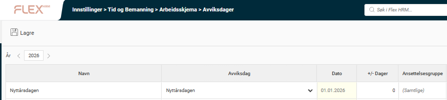 For å kontrollere avviksdager for det nye året, gå til Administrasjon > Innstillinger > Tid og bemanning > Arbeidsskjema > Avviksdager. Husk å velge år, for eksempel 2026.