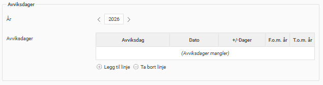 Dersom du allerede har tatt i bruk faste avviksdager under kolonnen Avviksdag, vil disse automatisk oppdateres for alle fremtidige år, og du trenger derfor ikke å gjøre noen manuelle endringer.