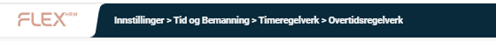 Vær oppmerksom på at avviksdagene også kan være inkludert i regelverkene for overtid, UB og beredskap. Dersom du benytter disse regelverkene, anbefaler vi at du også kontrollerer dem. Du finner regelverkene under Administrasjon > Innstillinger > Tid og bemanning > Timeregelverk.