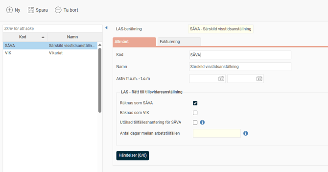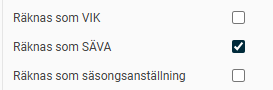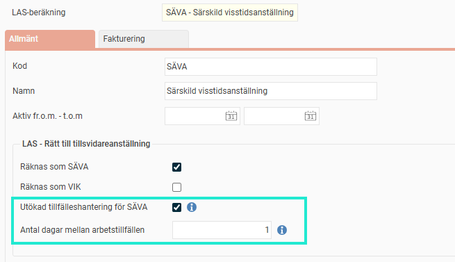 Väljer du Utökad tillfälleshantering för SÄVA krävs att Räknas som SÄVA också är valt och att Antal dagar mellan arbetstillfällen är ifyllt.