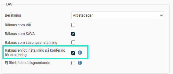- Beräkningsinställningen per anställningsform påverkar alla LAS-vyers beräkningar.
