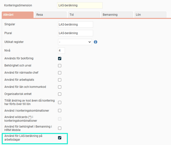 För att använda funktionen skapar du en egen konteringsdimension för detta ändamål och bockar i Används för LAS-beräkning på arbetsdagar. Denna bock tillåts inte för utökade register.