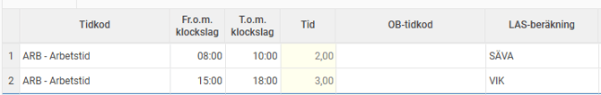 - Om kontering för VIK använts på tidrad och det även finns en tidrad samma dag utan LAS-kontering kommer enbart en VIK-dag genereras.