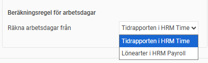 Beroende på om du använder HRM Time och/eller HRM Payroll kan du här välja om arbetsdagar ska räknas utifrån tidrapporten i HRM Time eller lönearter i HRM Payroll. Inställningen är per personalkategori.