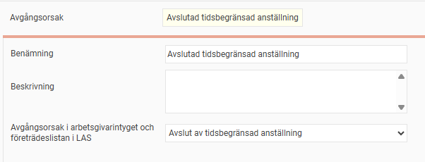 Beräkning utgår från inställningen för Avgångsorsak i arbetsgivarintyget och företrädeslistan i LAS och ställs in per avgångsorsak enligt exemplet nedan:
