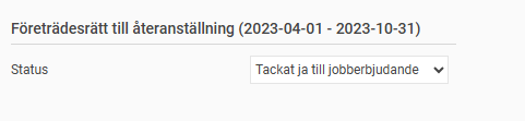 Status för Företrädesrätt till återanställning används för att på ett strukturerat vis se vem som fått besked om företrädesrätt, åberopat sin företrädesrätt, tillfrågats om jobberbjudande, tackat ja till jobberbjudande samt tackat nej till jobberbjudande.