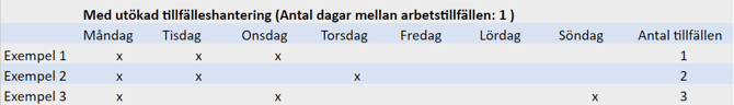 - Exempel med utökad tillfälleshantering (antal dagar mellan arbetstillfällen inställt 1 enligt ovan bild)