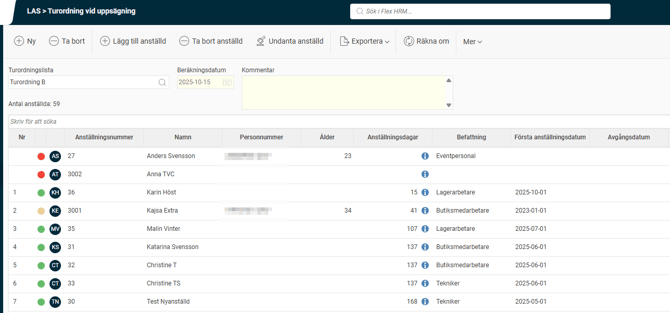I HRM finns en egen vy under Personal > LAS > Turordning vid uppsägning, där beräkningarna för turordningen utförs och visas.