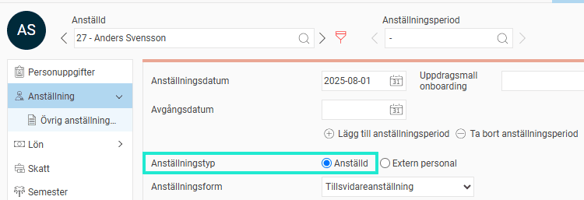 - Att den anställde är markerad som Anställd i Anställningstyp i anställdaregistret.