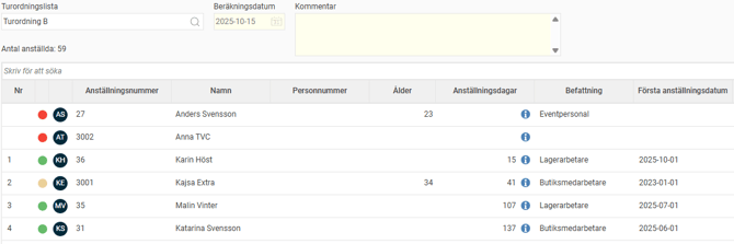 När du har valt en turordningslista får du upp en lista med de anställda som ingår. Du kan enkelt sortera på vilken kolumn du vill genom att klicka på rubriken.