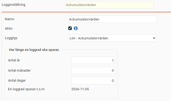 Välj en Loggtyp och Hur länge en loggrad ska sparas.