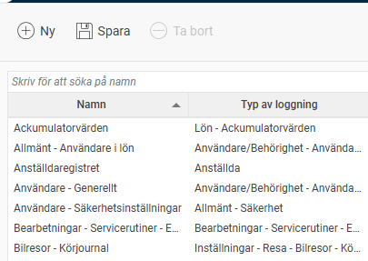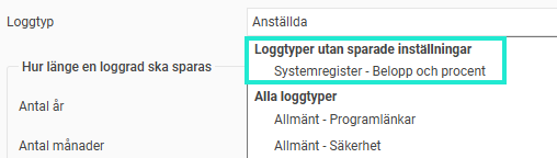 Tips: När du klickar i rullgardinsmenyn för Loggtyp visas de loggtyper som ännu inte har en sparad rad överst i listan. Det gör det enklare för dig att se vilka loggar du inte har lagt till.
