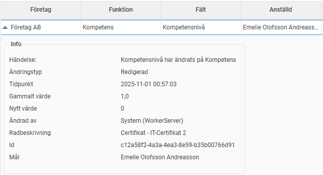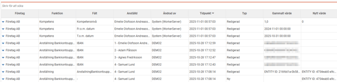 När du markerar en rad i listan till vänster (exempelvis "Anställdaregistret"), visas alla loggposter för den i listan till höger. Här ser du alla loggade ändringar per fält.