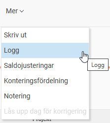 I tidrapporten hittar du en logg på stämplingar/registrerad tid under Mer - Logg.