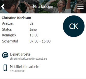 Funktionen Mina kollegor i appen HRM Mobile fungerar både som närvarotablå och kontaktinformation till dina kollegor.