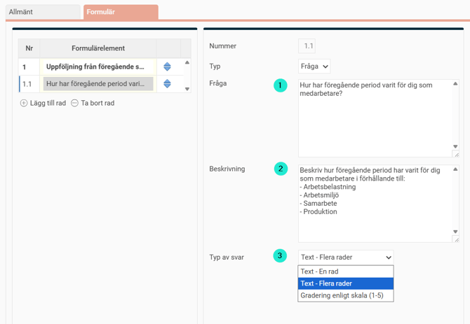 Beskrivning till en fråga i mallen är användbart om du t.ex. vill förklara en betygsskala eller vill ge lite mer information bakom en fråga i formuläret.