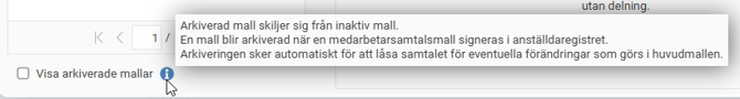 Det innebär att om du ändrar i huvudmallen efter att alla startade samtal är signerade så kommer det endast att påverka nya samtal som skapas från mallen. Det är viktigt att alla samtal är signerade om du inför nästa samtal vill ändra/lägga till frågor i mallen utan att påverka befintliga samtal. Du kan se arkiverade mallar genom att kryssa i rutan Visa arkiverade mallar.