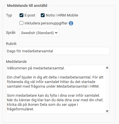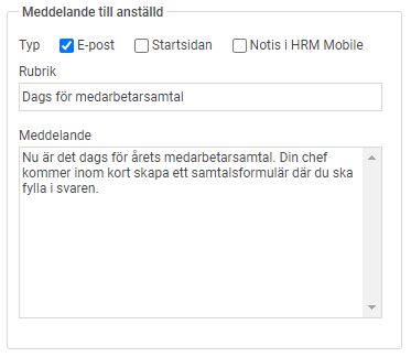 - Om du vill att medarbetaren ska få information om att medarbetarsamtal ska startas kan du aktivera det under Meddelande till anställd och skriva ett meddelande.