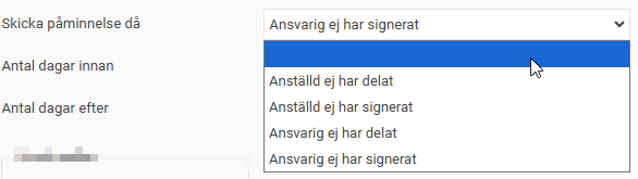 - Skicka påminnelse då - Här väljer du om påminnelsen gäller anställd eller ansvarig som inte har delat eller signerat. För att få påminnelse på alla fyra behöver du alltså skapa fyra olika påminnelser.