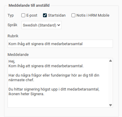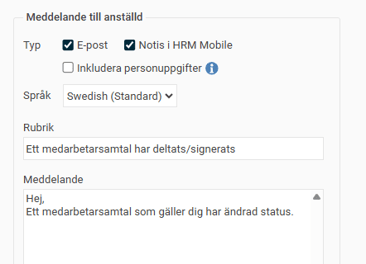 - Meddelande till anställd. Här anger du om medarbetaren ska få information via e-post eller notis.