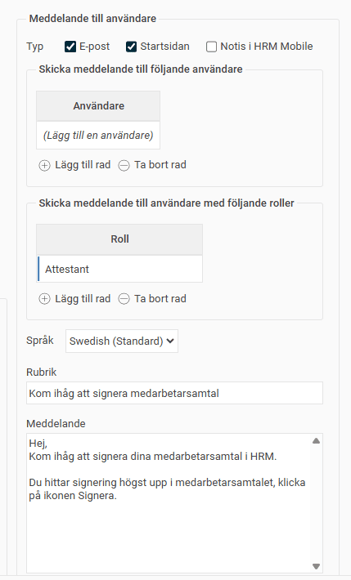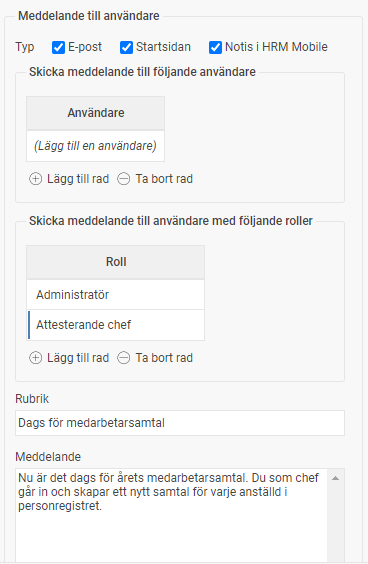 - Under Meddelande till användare kan du välja om t.ex. chefen eller HR ska få en notis när medarbetarsamtal skapats. Detta kan vara användbart om chefen själv inte skapar medarbetarsamtalet.