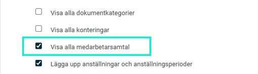 En roll som har denna ruta ikryssad får då se alla medarbetarsamtal på de flikar man har behörighet till. Man får då se medarbetarsamtal även om man inte är ansvarig eller berörd medarbetare. På så sätt kan man låta en ny chef se gamla samtal, eller ge en HR tillgång till samtal.