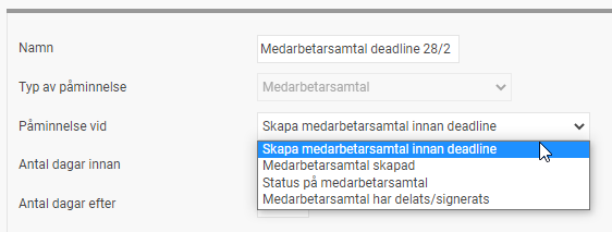 Välj först Medarbetarsamtal under Typ av påminnelse. Därefter kan du välja bland fyra olika alternativ som man ska generera påminnelser.