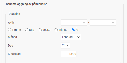 - Schemaläggning av påminnelse. Här anger du deadline för när alla medarbetarsamtal ska vara klara. I exemplet nedan är deadline för att skapa upp samtal för årligt medarbetarsamtal den 28 februari kl. 13.00.