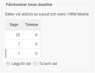 - Under Påminnelser innan deadline anger du vid vilka tidpunkter innan deadline man ska få påminnelse via e-post eller notis i HRM Mobile om man ännu inte startat samtalen för alla.