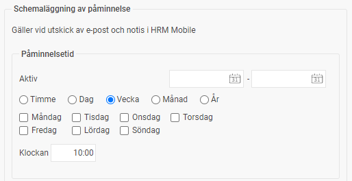 - För utskick av påminnelser till e-post och notiser i HRM Mobile anger du under schemaläggning av påminnelse hur ofta utskick ska göras.