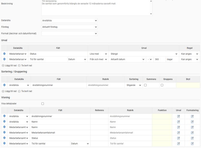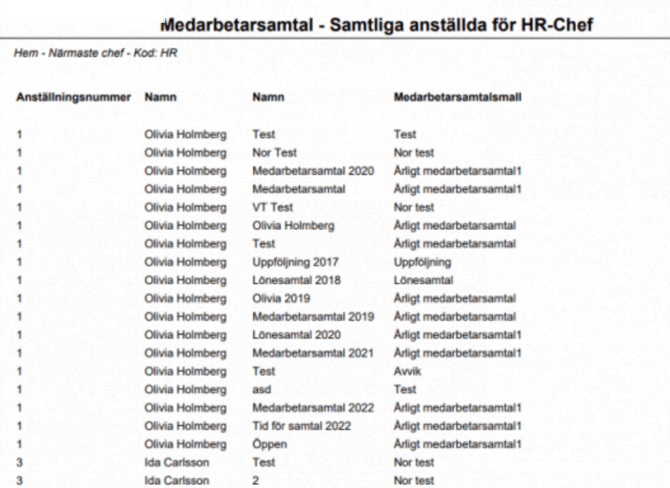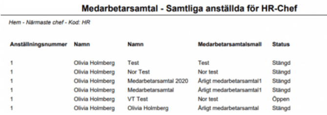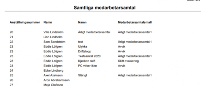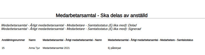 Om inget urval i rapportgeneratorn är gjort och du väljer att visa medarbetarsamtal under Visning så får du ut samtliga anställda och samtliga medarbetarsamtal på de anställda som har något på sig. Detsamma gäller formulär.