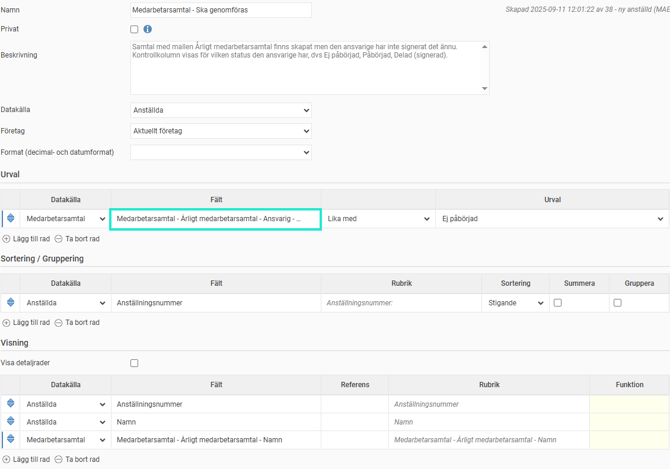 Här tar du fram samtal som finns skapade men som inte är signerade genom att sätta urvalet Medarbetarsamtal > Årligt medarbetarsamtal1 > Ansvarig > Samtalsstatus: