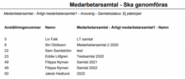Syftet med den här funktionen är att du ska kunna följa upp status för medarbetarsamtal och formulär via rapportgeneratorn. Det kan handla om att få en lista på de som ännu inte bokat sina samtal enligt plan eller se att alla chefer genomfört sina samtal. Det handlar alltså inte om att få ut svar från medarbetarsamtal/formulär.