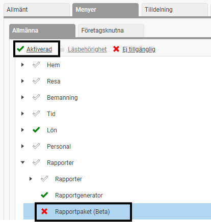 Du aktiverar åtkomst till funktionen på den Roll vars användare ska kunna bygga och ta ut rapportpaket.